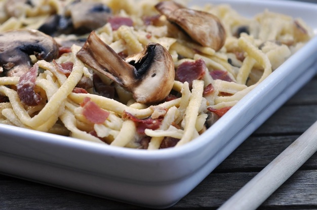 In a large pan, cook the bacon over medium heat. When some of its fat has been released, add the garlic. Keep stirring to prevent the garlic from burning. Cook for 1-2 minutes, then add the mushrooms. Cook for another 4-5 minutes, until mushrooms are cooked. Pour in cream. Crumble the bouillon cube and sprinkle over the bacon mushroom cream mixture. Turn heat down to low and let simmer for another 2-3 minutes.